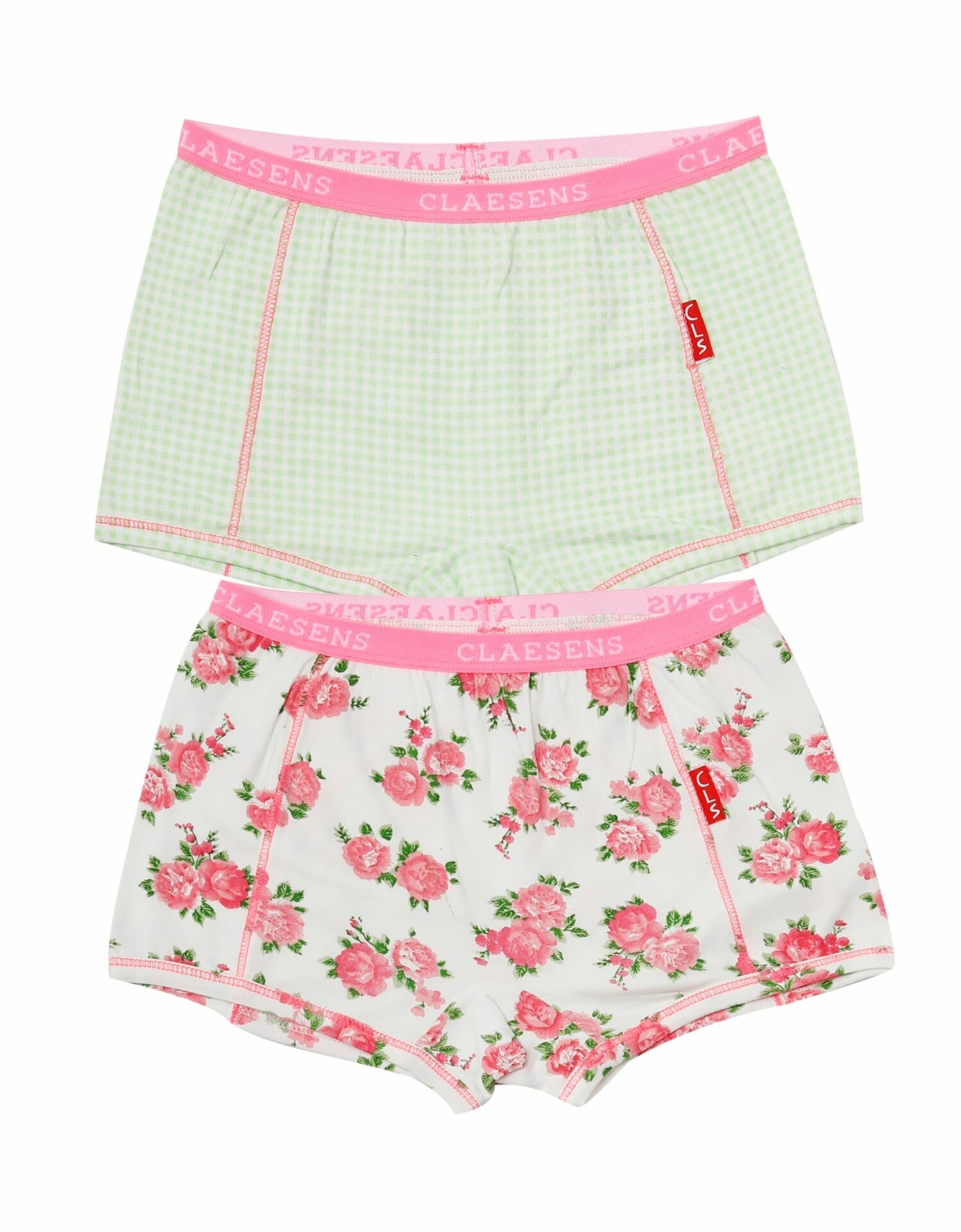 Meisjes boxer 2-pack; Een boxertje in off- white met een roze rozenprint. De andere boxer in wit met een licht groen ruitje. Beide boxertjes hebben een knalroze elastieke tailleband met een wit claesen's logo en biesjes langs de beenopening. Knalroze stiksels als accent. Gemaakt van hoogwaardige cotton/ lycra (95% cotton/5% lycra)